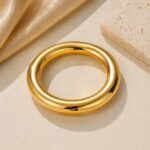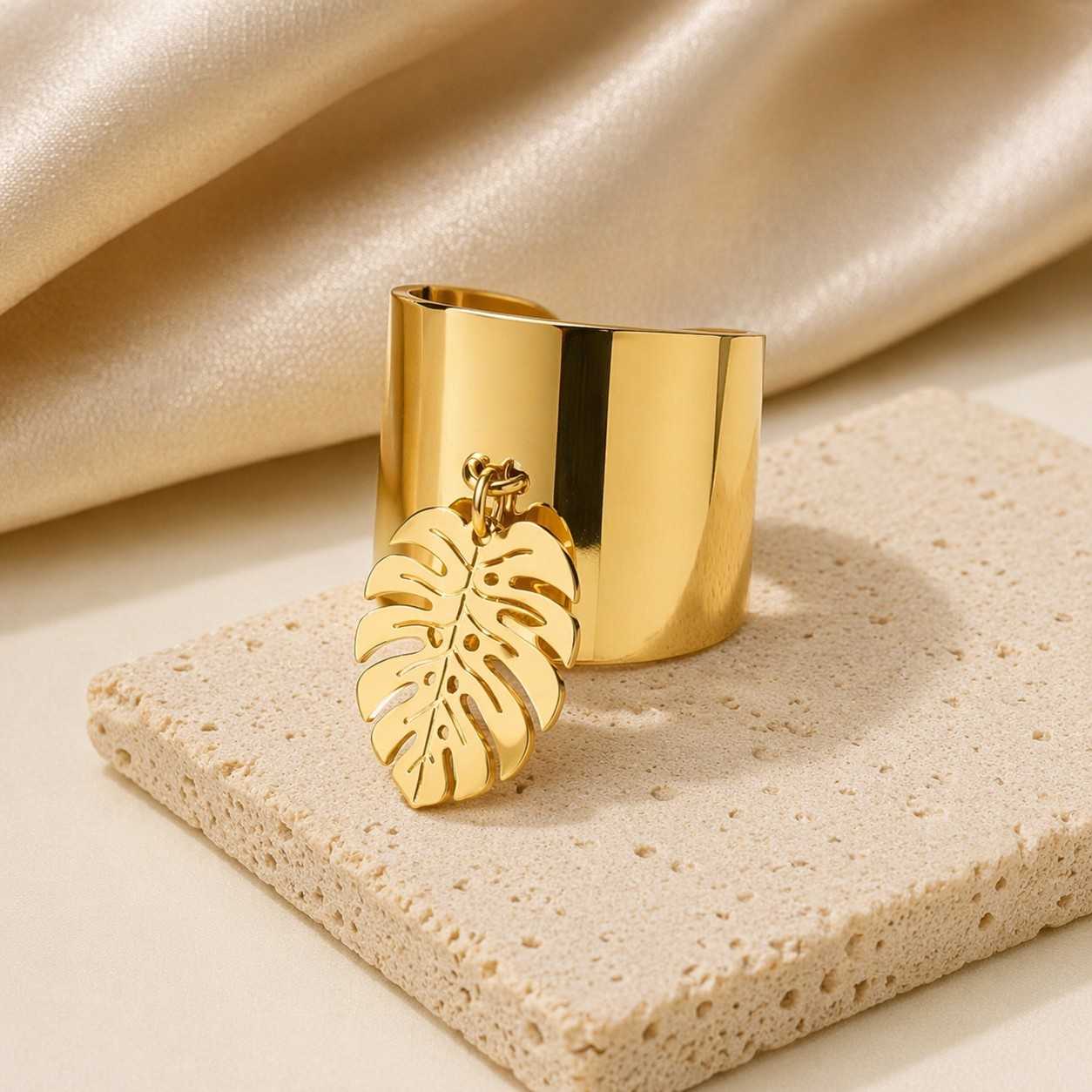 Su estructura rígida tipo cuff en acabado dorado brillante se complementa con un delicado colgante en forma de hoja, creando un contraste perfecto entre fuerza y detalle orgánico.